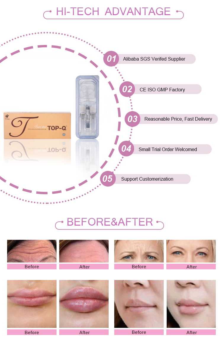 TOP-Q ® Hyaluronic Acid Dermal Fillers is biodegradable gel made of no-animal cross-linked hyaluronic acid, substance that mimics the body's natural depleted hyaluronic acid. They offer a complete solution for using facial line wrinkles, and lips. It also can be used in facial sculpting by enhancing natural facial contours and features.