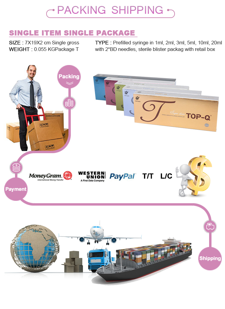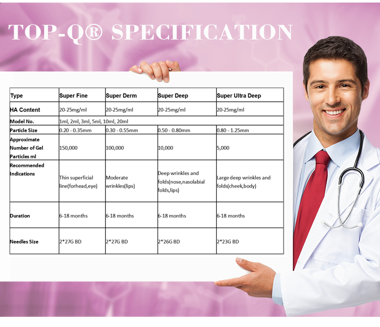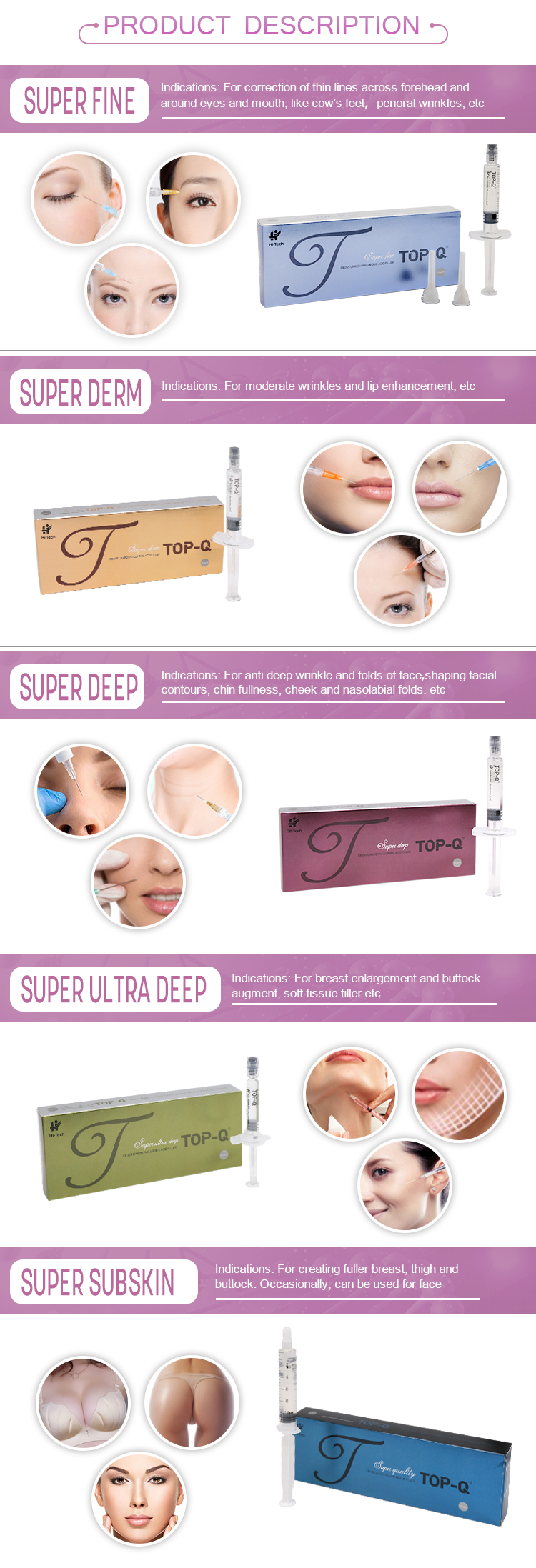 TOP-Q ® Hyaluronic Acid Dermal Fillers is biodegradable gel made of no-animal cross-linked hyaluronic acid, substance that mimics the body's natural depleted hyaluronic acid. They offer a complete solution for using facial line wrinkles, and lips. It also can be used in facial sculpting by enhancing natural facial contours and features.