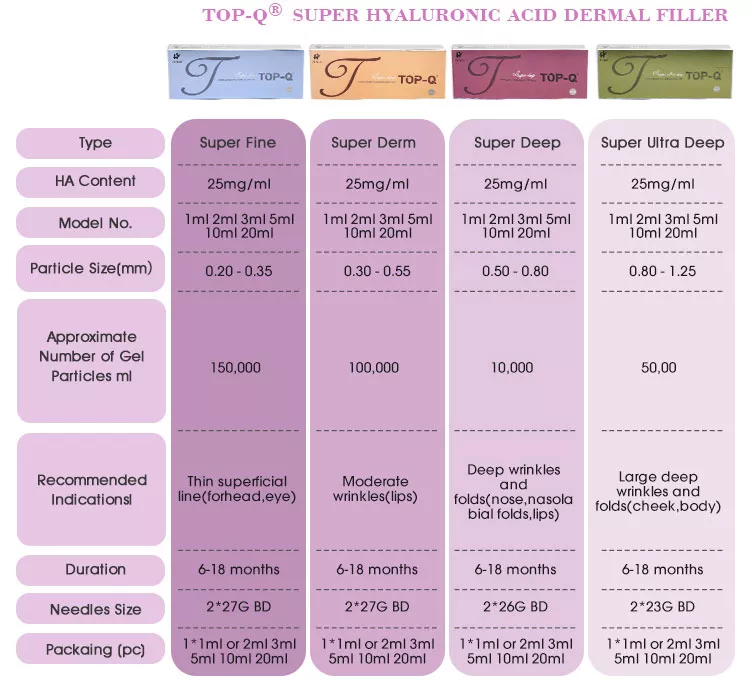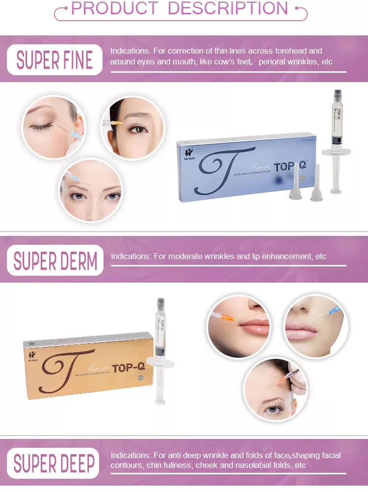 TOP-Q ® Hyaluronic Acid Dermal Fillers is biodegradable gel made of no-animal cross-linked hyaluronic acid, substance that mimics the body's natural depleted hyaluronic acid. They offer a complete solution for using facial line wrinkles, and lips. It also can be used in facial sculpting by enhancing natural facial contours and features.