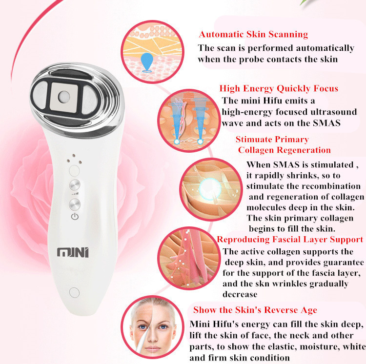 HIFU (High Intensity Focused Ultrasound) owns the non-invasive and focused penetrating advantage.By HIFU technology, it can use the non-invasive way (without surgery or injection) to act on designated subcutaneous area. The subcutaneous tissue will produce transient heating under high-frequency vibration, to up to the treatment energy which makes the skin tissues cells re-growth.